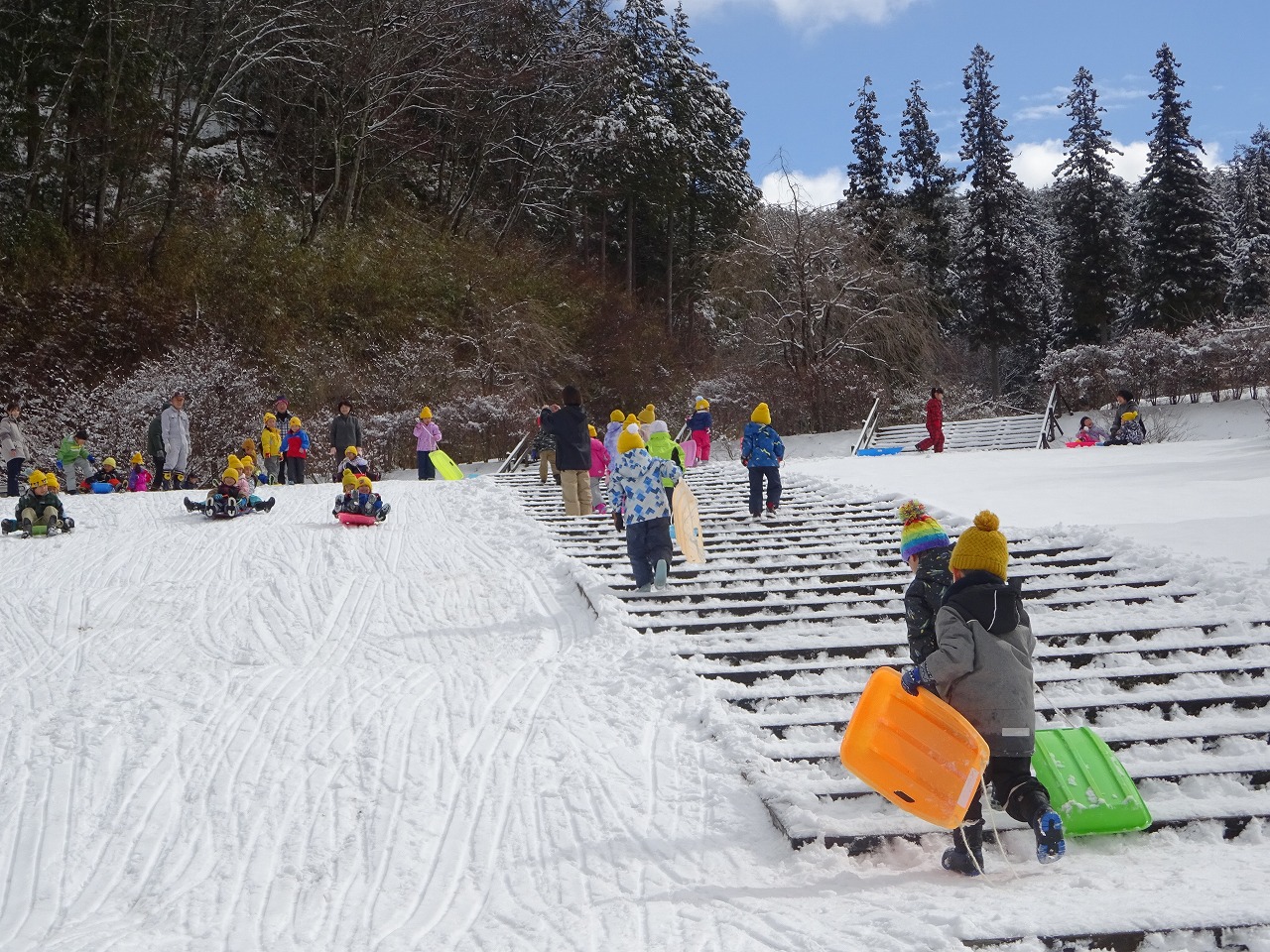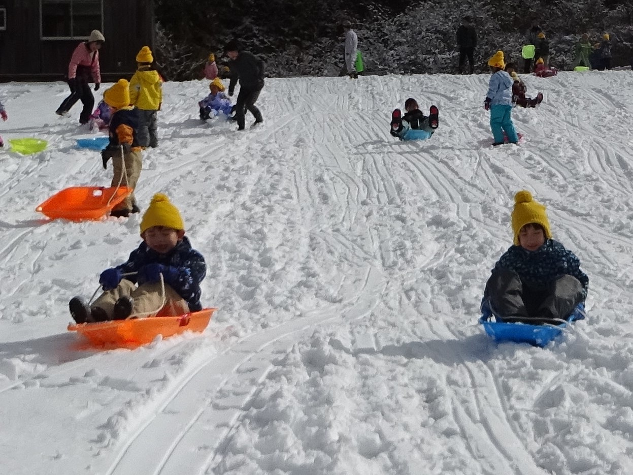 たくさんの雪に大はしゃぎの年長さん。 長い斜面を何度も滑り降り、時間いっぱい思い切り楽しむことができました。 自然の中でたくさん体を動かし、楽しい思い出となりました。