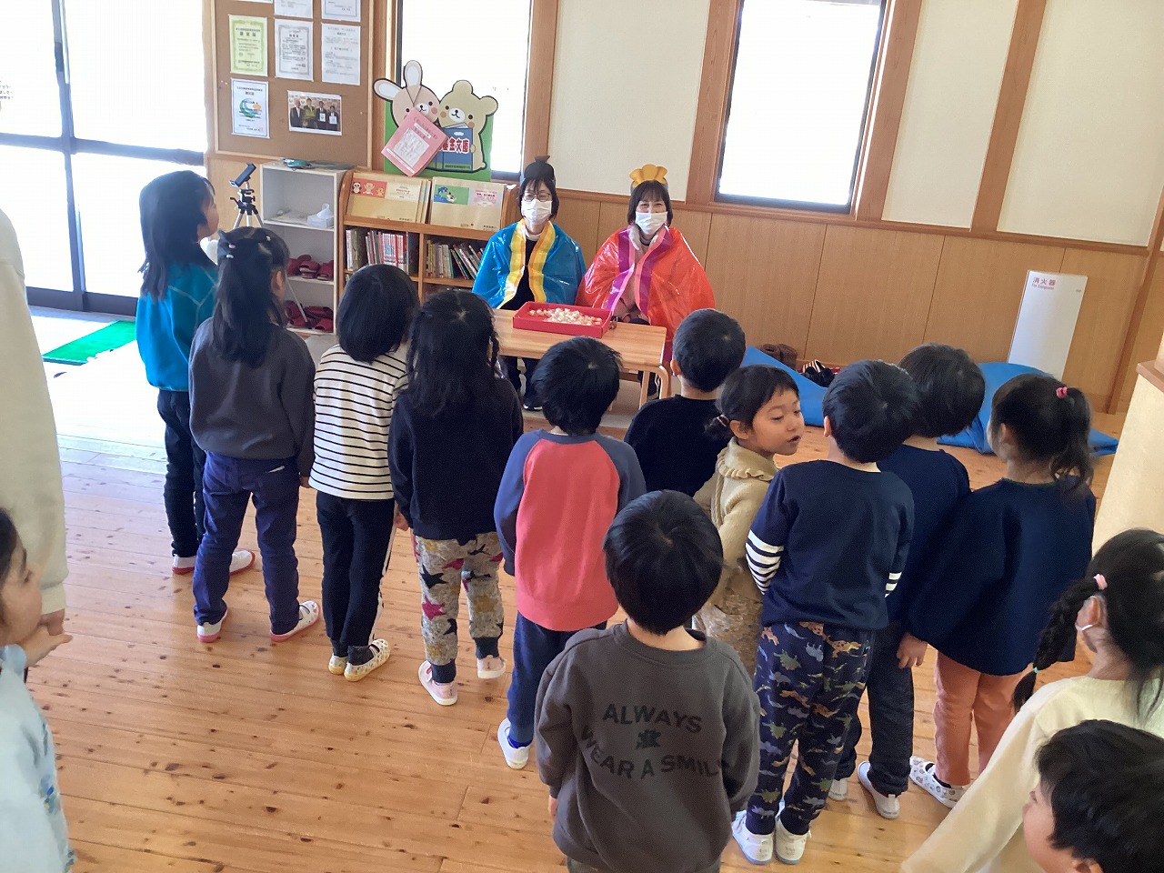 今日は、ひなまつりの会を行いました。 会では、それぞれのお雛様の作り方や頑張ったところを紹介し合ったり、年長の女の子による可愛らしい踊りを見ながら歌を歌いました。