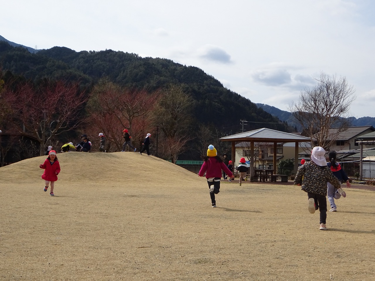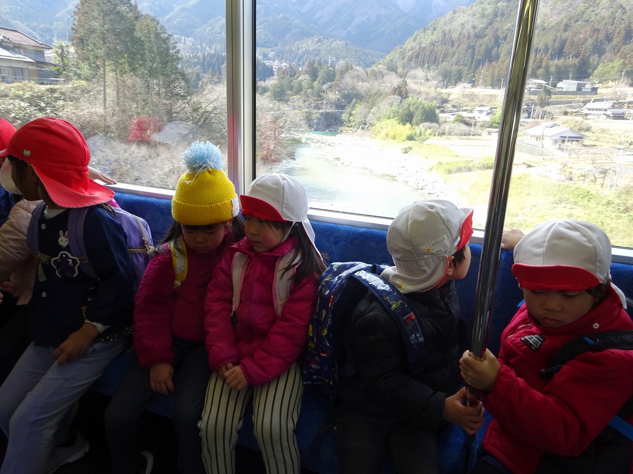 こども園最後の遠足は、列車に乗って小坂の「きこり公園」まで行ってきました。 初めて列車に乗る子もいて、いつもと違う景色を見てワクワクしながら楽しく乗ることができました。
