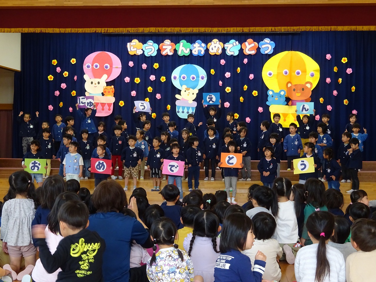 今日は、全園児で新入園児歓迎会を行いました。 初めに、年中さんがステージで「みなみこども園のうた」を披露してくれました。 年長さんは、「Bling-Bang-Bang-Born」と「唱」のダンスと“にゅうえんおめでとう”の言葉をプレゼントしてくれました。