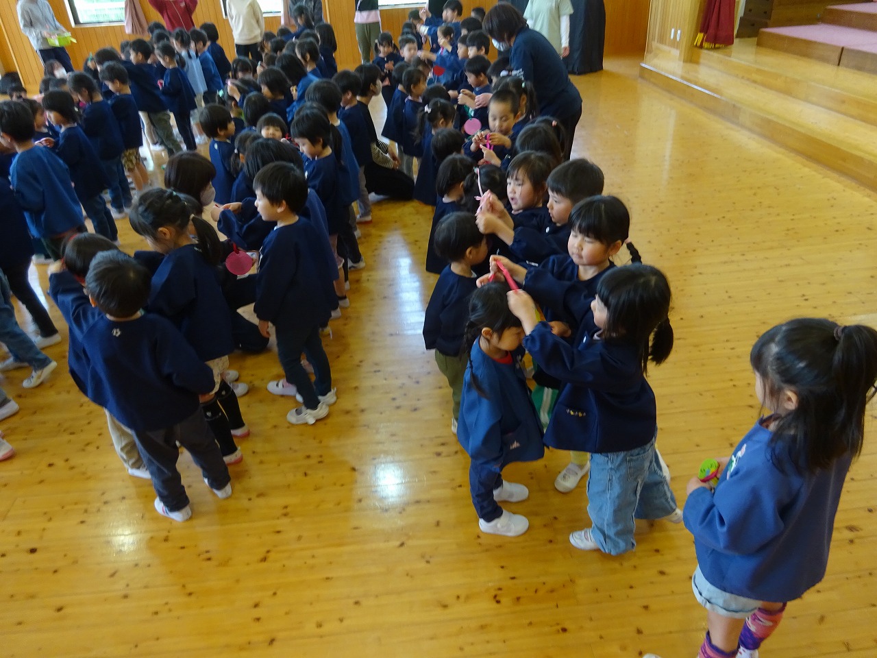 最後に、みんなでアンパンマン体操を踊り、年長さんが「一緒にあそぼうね!」と新入園児にペンダントを掛けました。 みんな楽しそうで、笑顔いっぱいの会となりました。