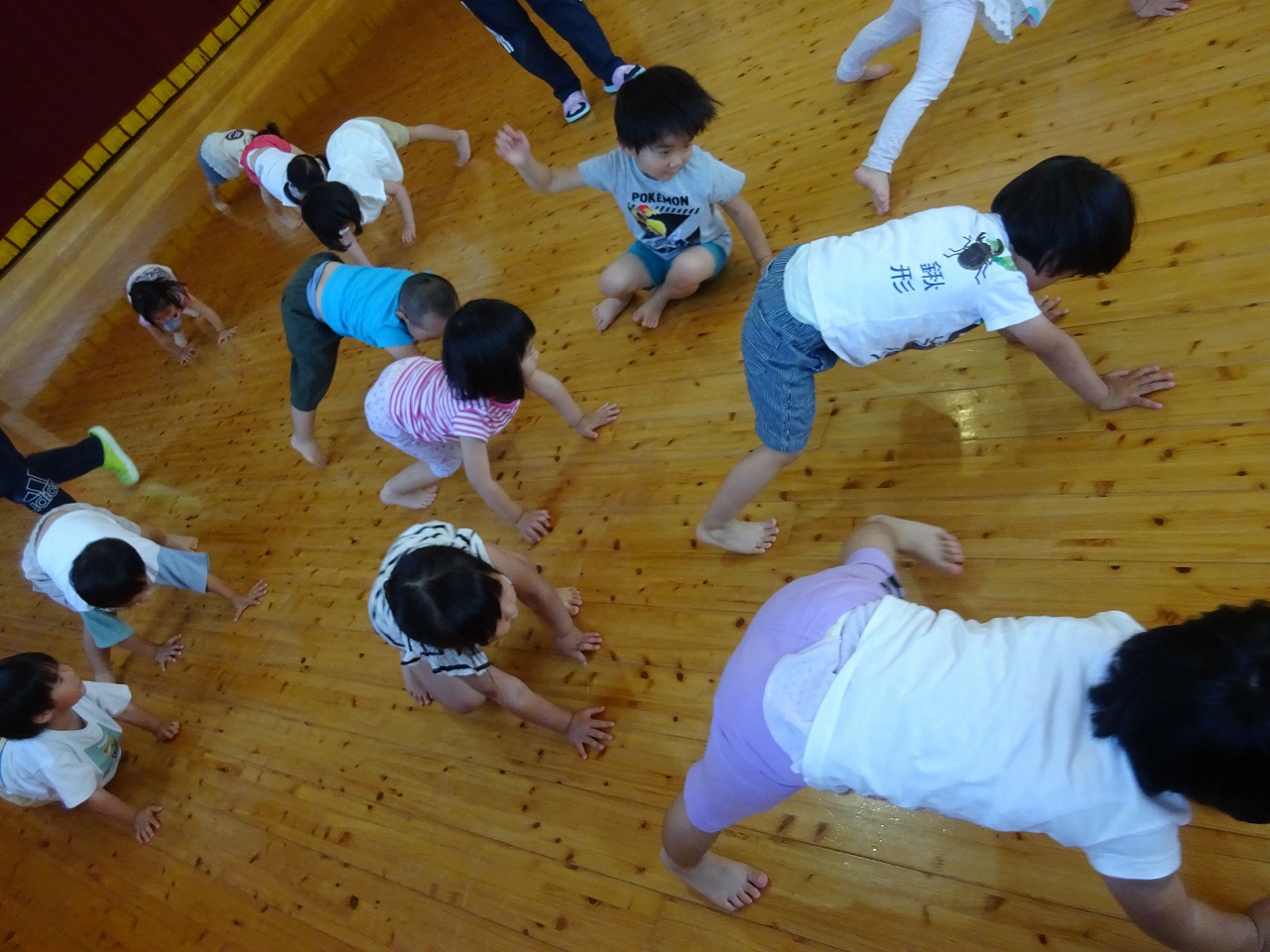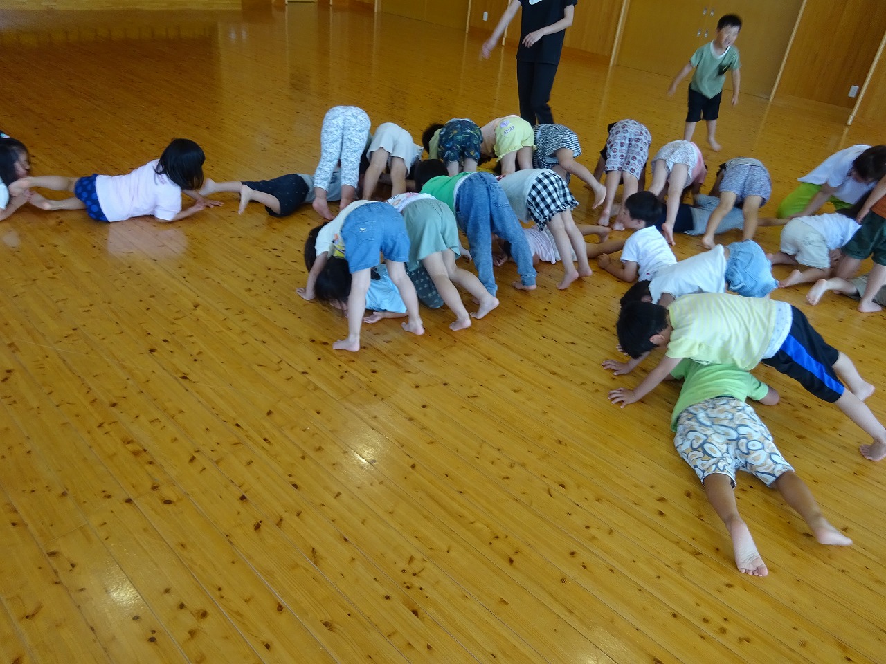じゃんけん列車では、「負けた人はライオントンネルになり、勝った人はその下をヘビで潜る」ことを繰り返しました。どんどん長くなっていくトンネルにワクワクしながら楽しく体を動かしました。