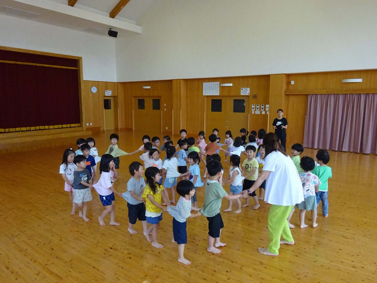 ペア活動では、「船漕ぎ」「なべなべそこぬけ」や「あたまかたひざぽん」をピアノに合わせて楽しみました。