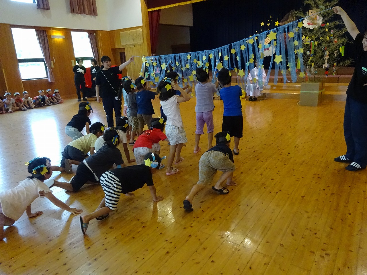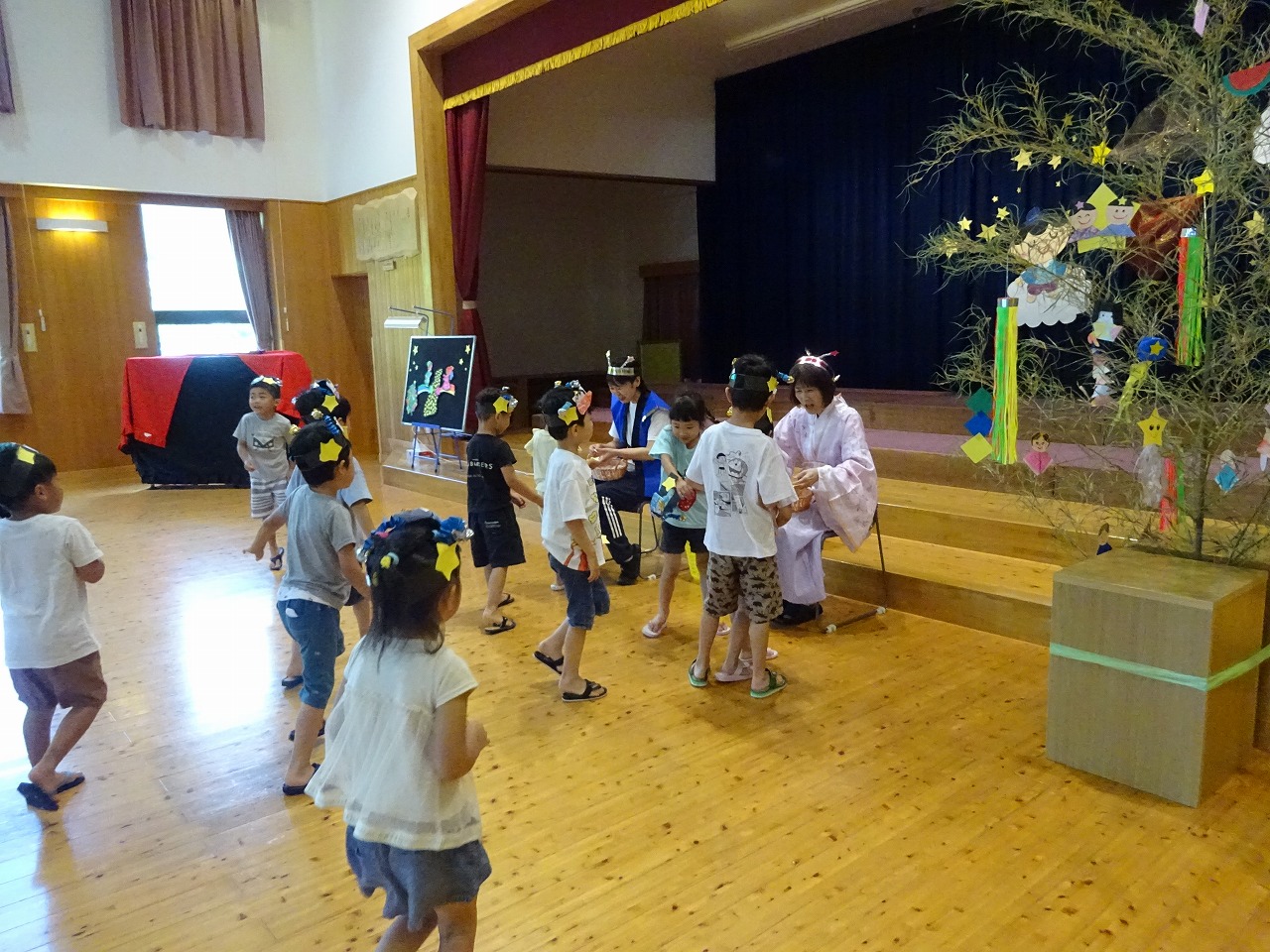 みんなで「たなばたさま」の歌をプレゼントしました。 お楽しみでは、年齢に合わせた「星つかみゲーム」に挑戦しました。 織姫様と彦星様が星とお菓子を交換してくれ、大喜びの子ども達でした。 みんなの願いが叶いますように☆彡