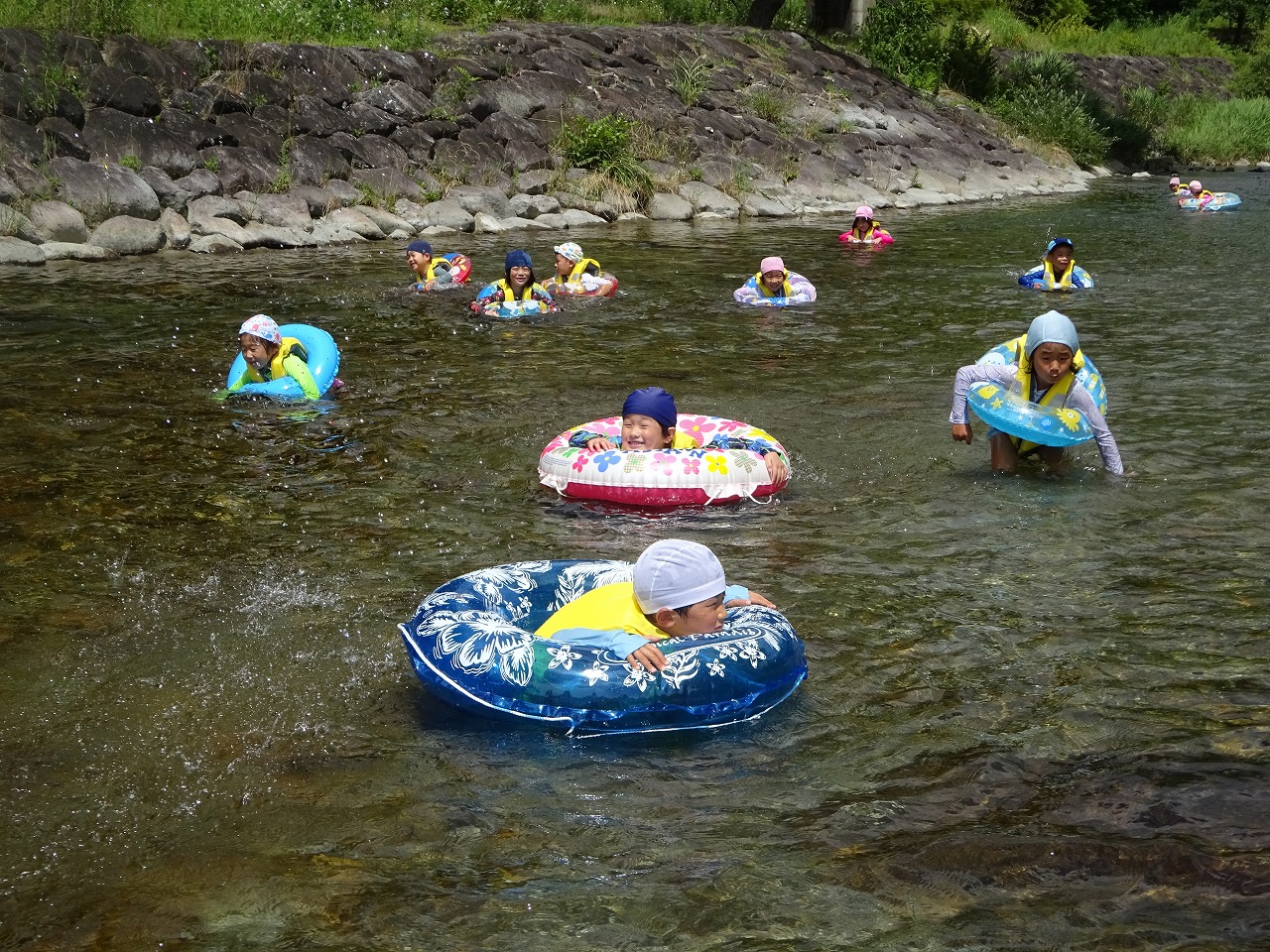 今日は、年長さん全員で山之口の川へ遊びに行ってきました。 浮き輪で川を流れたり、あかべらやおたまじゃくしを夢中になって探したり、大自然に囲まれてたくさん遊ぶことができました。