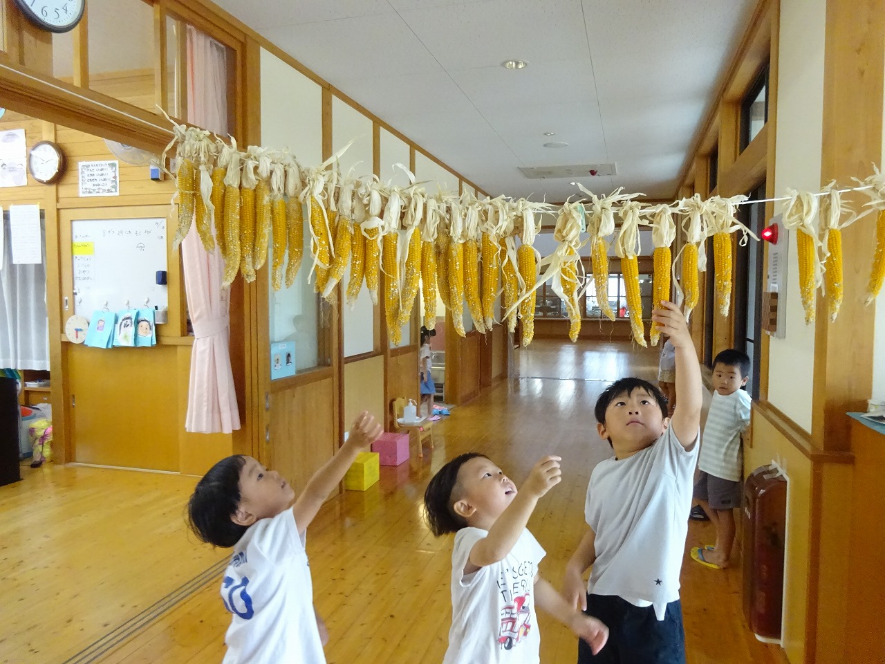 今日は、年中さんがみなみ農園で大切に育てたイエローポップコーンを使って、ポップコーンクッキングを行いました。 5月に種をまき、8月に収穫をして、1ヶ月吊るして乾燥させました。