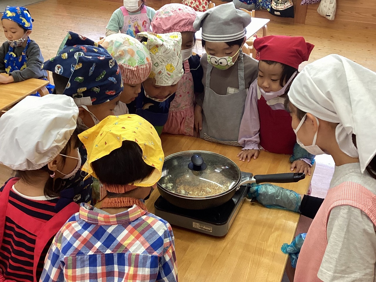 先日は、乾燥したポップコーンの実を頑張ってほぐしました。 今日は待ちに待ったクッキング。 フライパンの中を覗き込み、実が弾ける様子を夢中になって見ていました。 自分たちで育てたポップコーンは、より美味しく感じたようで「美味しい!」と大喜びでした。 他の学年のお友だちにもお裾分けをしました。喜んでもらえてよかったです。