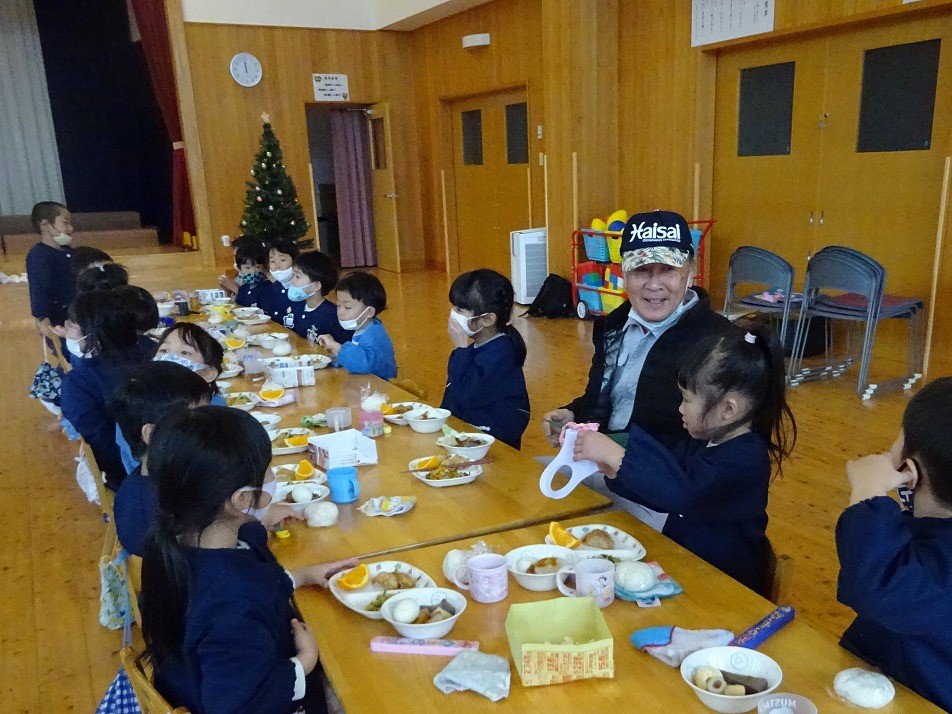 給食の時間に、炊き立てのご飯と、畑の大根を使ったおでんを食べました。 年長さんはお世話になった畑と田んぼの先生にお礼を伝え、一緒に楽しく食べました。 収穫の喜びを感じながら、たくさんおかわりをして、大満足の収穫祭となりました。