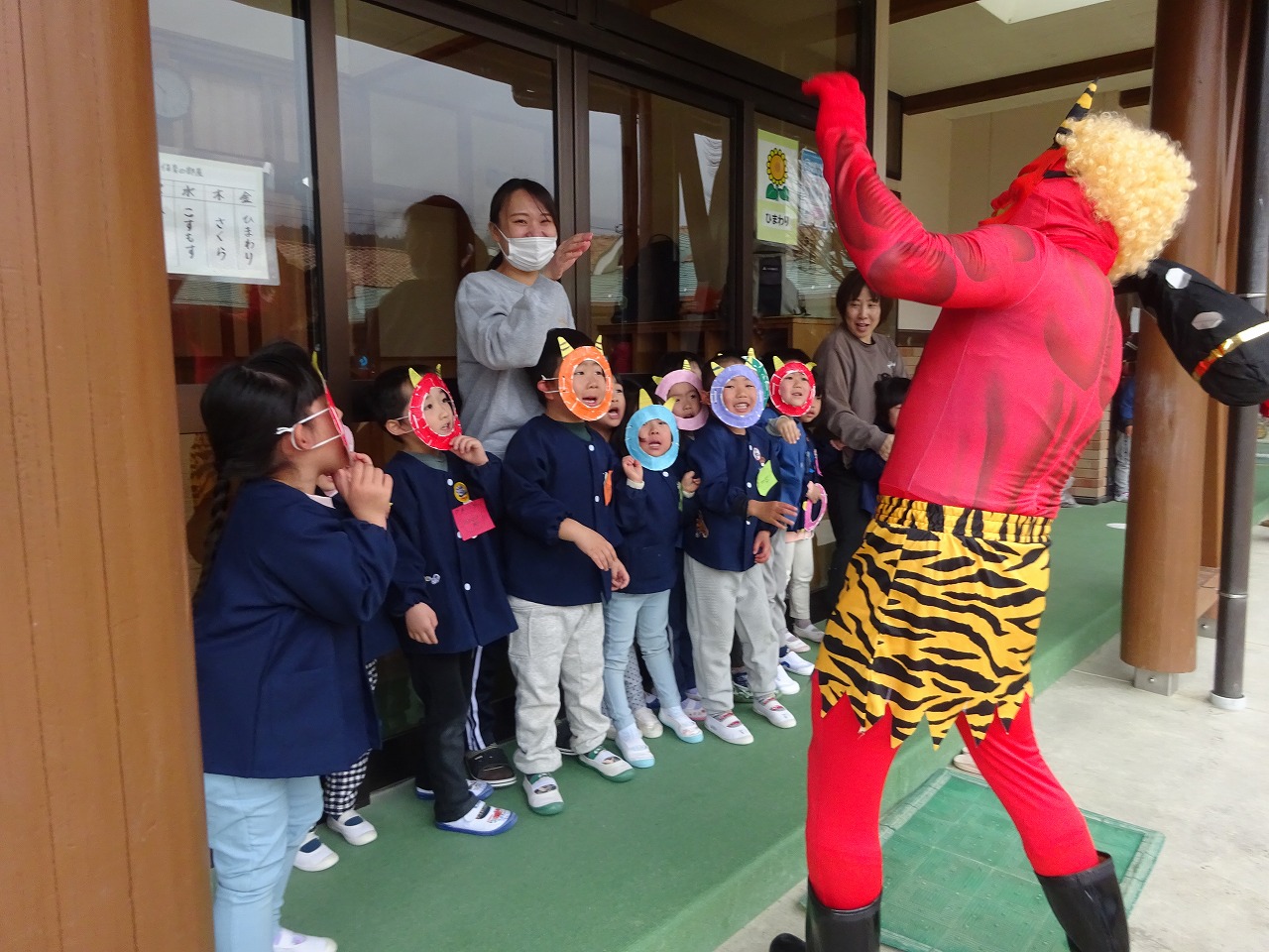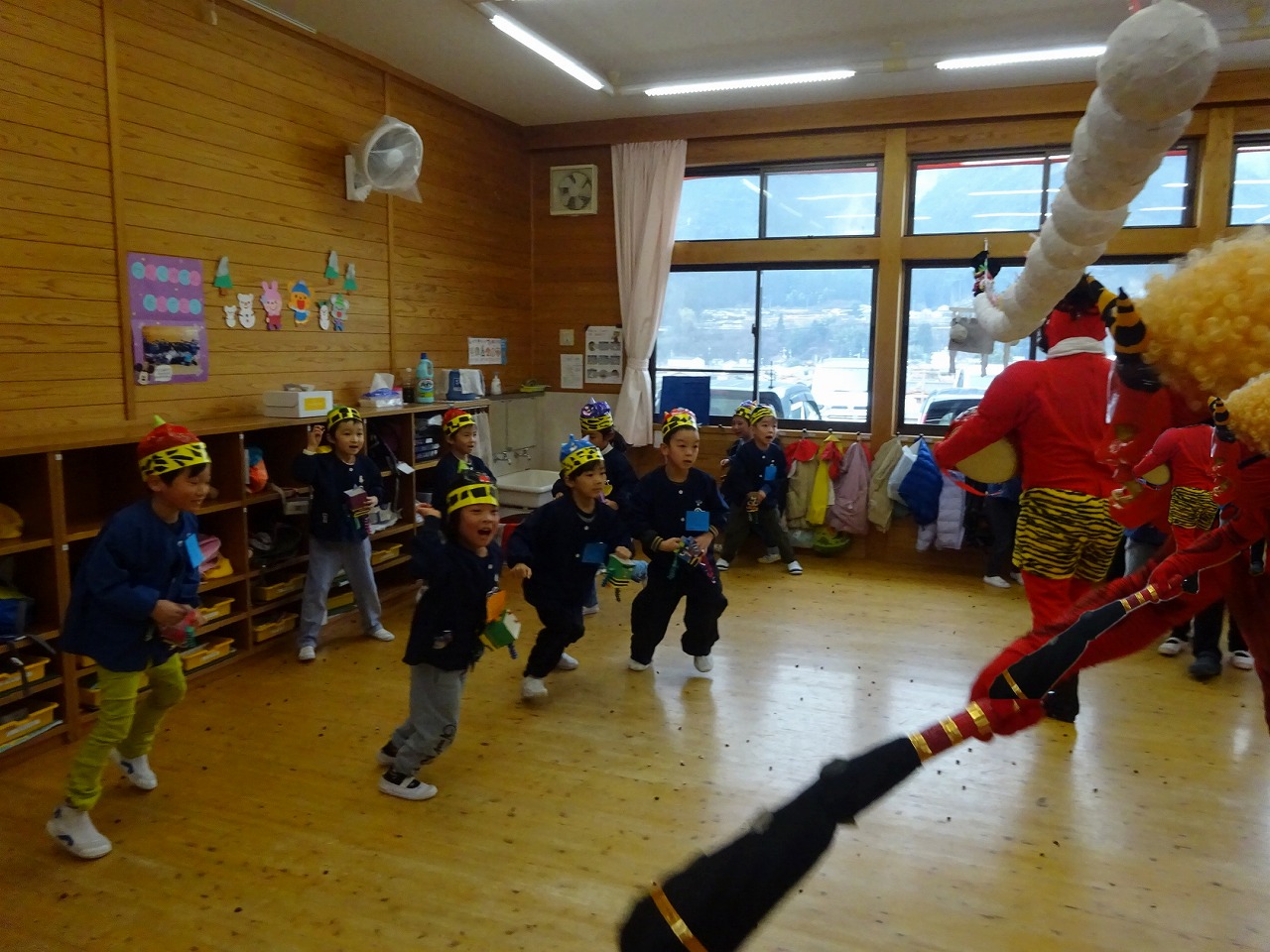 びっくりしながらも、大きな声で「鬼は外!福は内!」と豆を投げて追い払いました。 子ども達の大きな声に負けた鬼は、山へ帰って行きました。