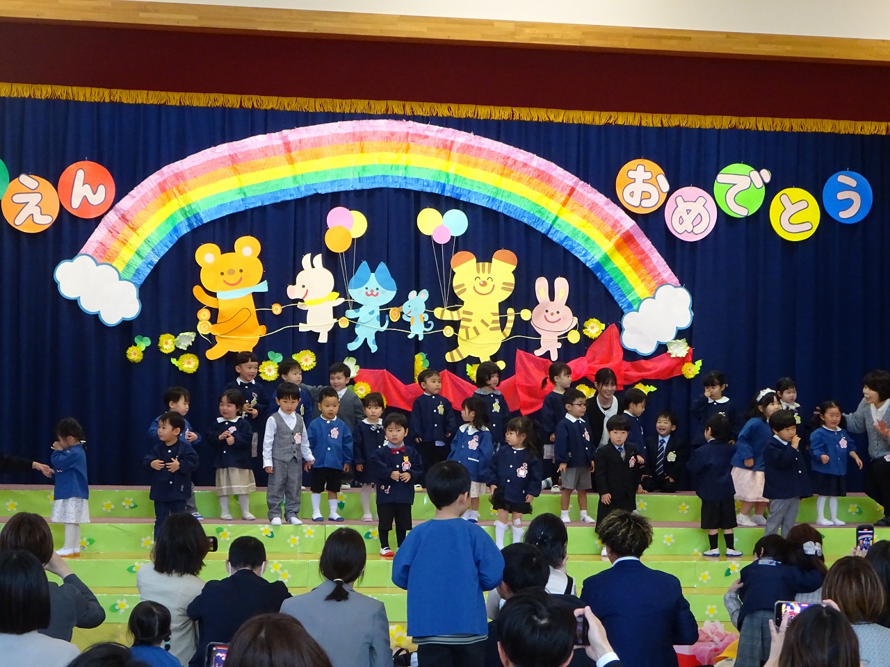 入園式では、名前を呼ばれた年少さん36名が元気にステージに上がり、アンパンマン体操を踊りました。 「元気いっぱい 笑顔いっぱい 友だちいっぱい」園目標通りの一年になりますように!