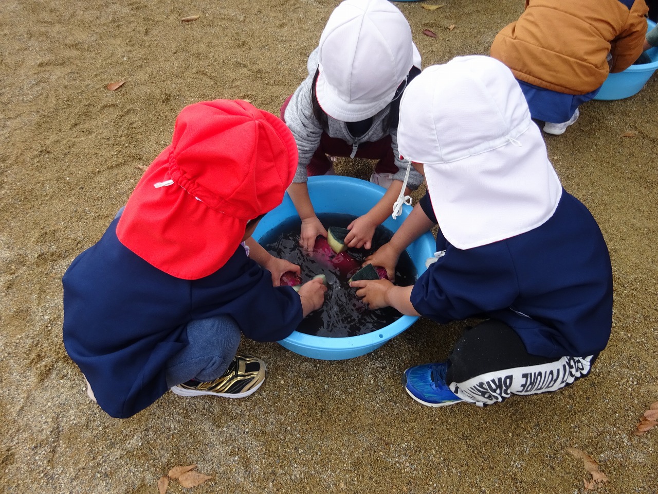 子ども達が楽しみにしていた、焼芋を行いました。 前日に年中さんがさつま芋を洗い、年長さんが新聞紙とアルミホイルでしっかり包みました。