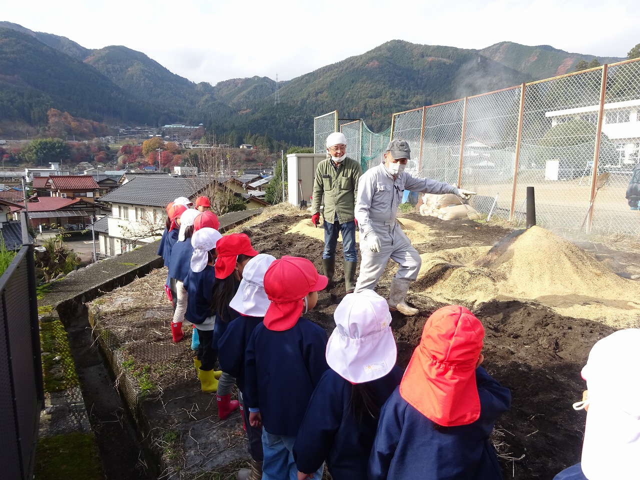当日は、畑の先生が朝早くから籾山でじっくり焼いてくれました。 子ども達は、美味しい焼き芋になるように、おまじないをかけました。 そして、いよいよ待ちに待ったおやつの時間! ほかほかの焼き芋が出来上がり、みんなで美味しく食べました。 年長さんは畑で焼き立てを頂き、「美味しい!」「最高!」とニコニコ笑顔になりました。
