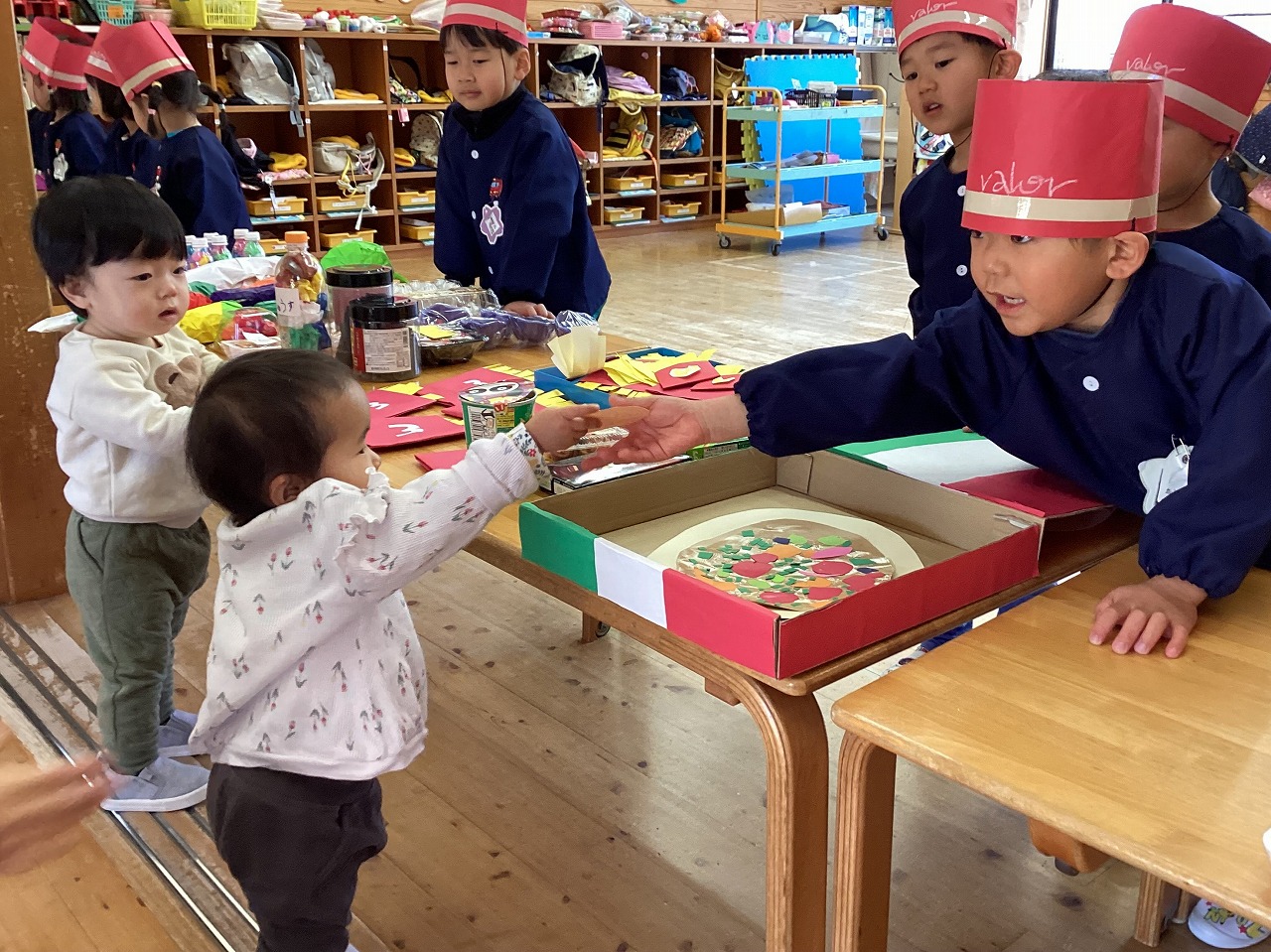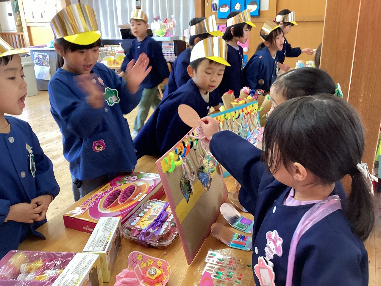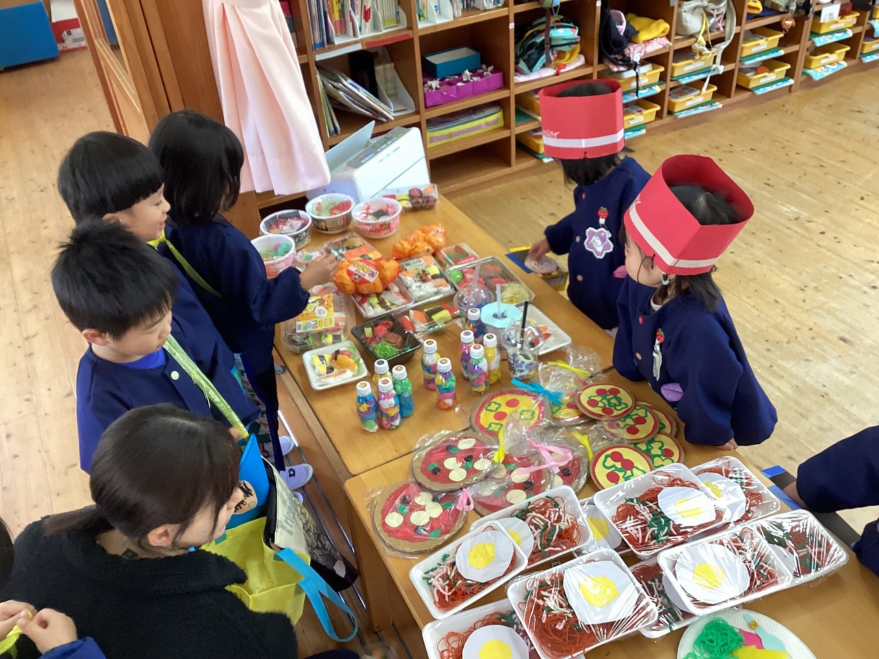 みんな大はりきりで店員になりきって、楽しんでいました。 年少さんと未満児さんも、たくさんの品物に目をキラキラさせながら嬉しそうに買い物をしていました。 「いらっしゃいませ〜!」「これください」「10円です」と、賑やかな声が響く楽しい時間となりました。