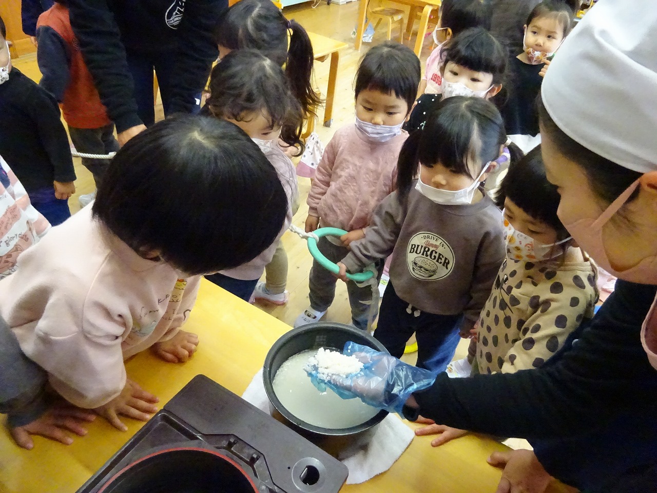 中学校3年生の皆さんが、家庭科の授業で「ふれあい体験」に来てくれました。 |