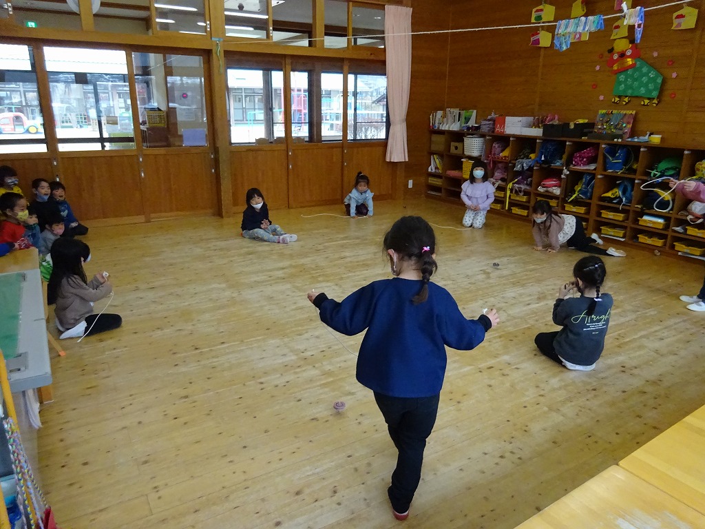 正月遊びの一つとして、今年もこま回しを始めました。 |