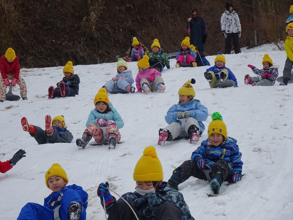 年長さんは皇樹の杜へ行き、きたこども園の年長さんと一緒にそり滑りをしてきました。 |