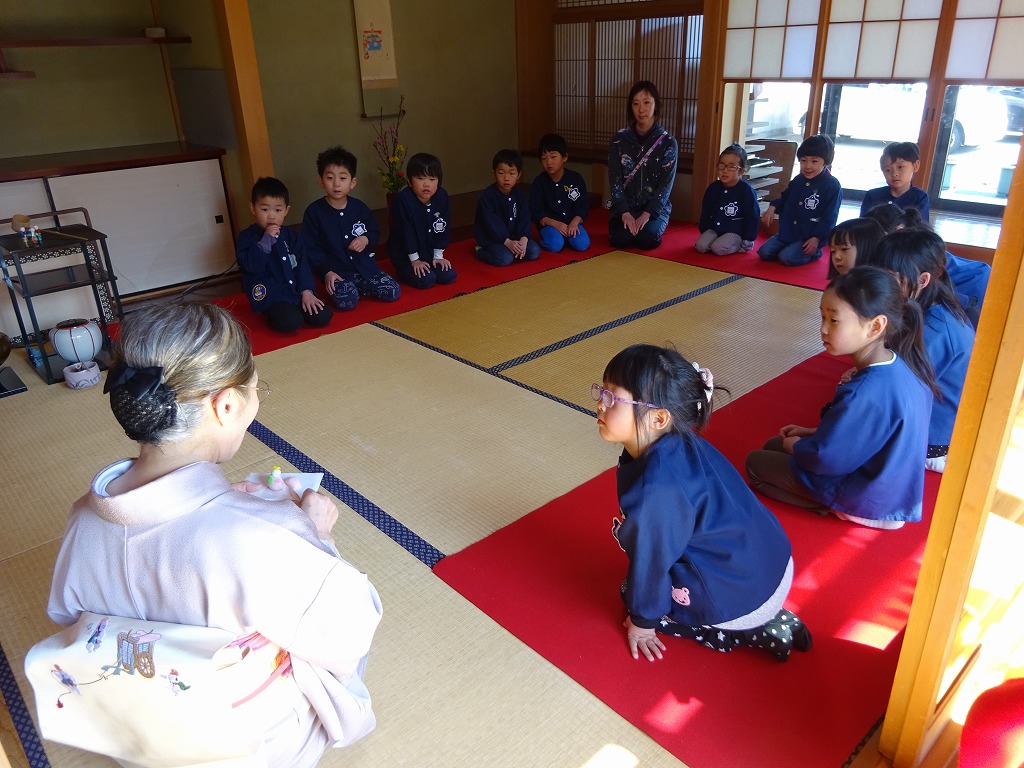 “年長さんの卒園のお祝いに・・・”と地域の方のご厚意で子育て広場の和室でお茶会が開かれました。 |