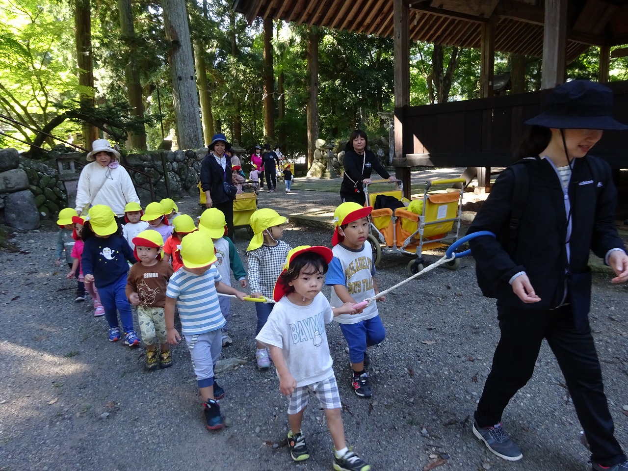 今月の誕生会は、未満児さんと年少さんは中学校の校庭、年中さんと年長さんは諏訪神社で行いました。 |