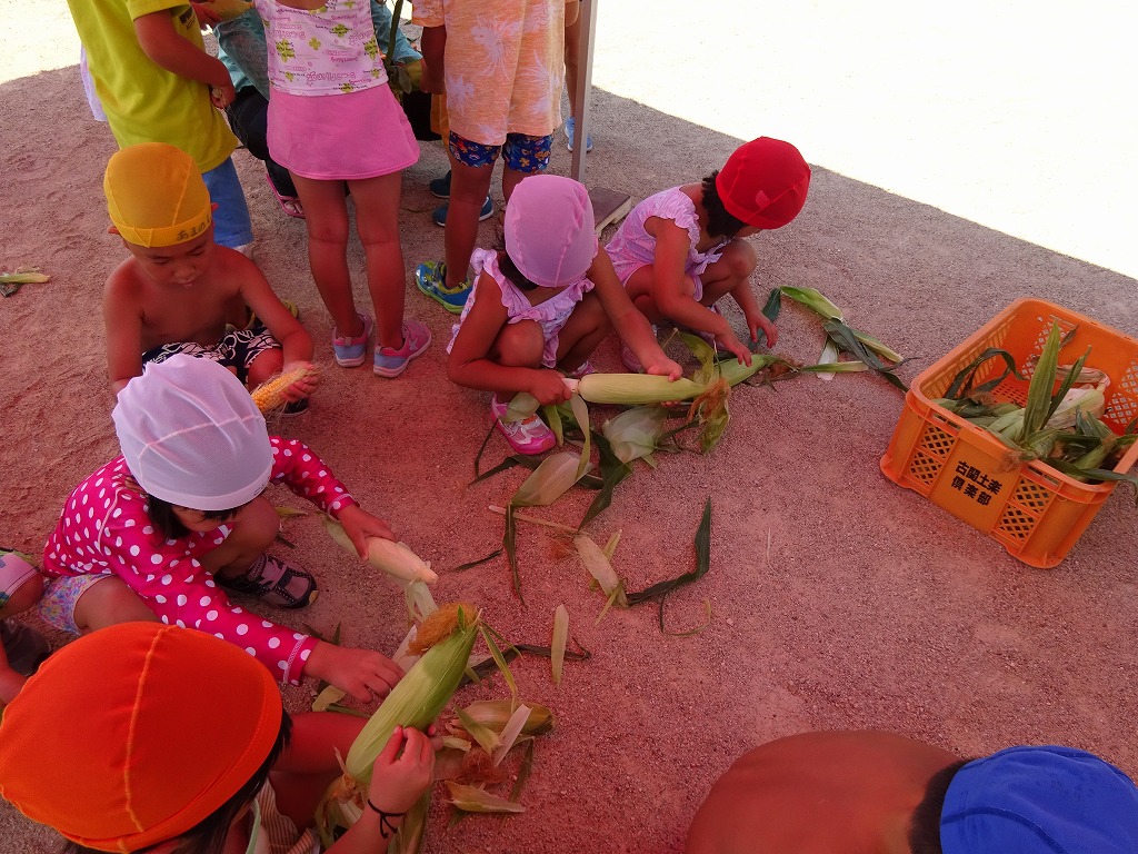 昨日収穫したとうもろこしを一人一本ずつ皮をむいて、今日のおやつにゆでてもらうことにしました。 |