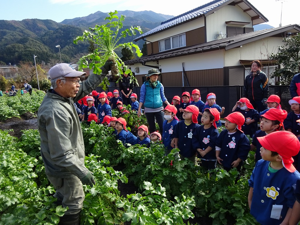 天気に恵まれ、大根の収穫日和となりました。子ども達に「大根の種はとても小さかったけど、畑の大根はどうなってるかな?」と尋ねると「おおきくなったよ!」と返ってきました。 |