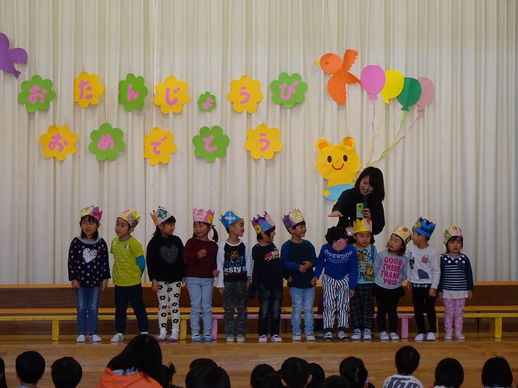 秋晴れの中、和やかな雰囲気で11月生まれの誕生会が行われました。 |