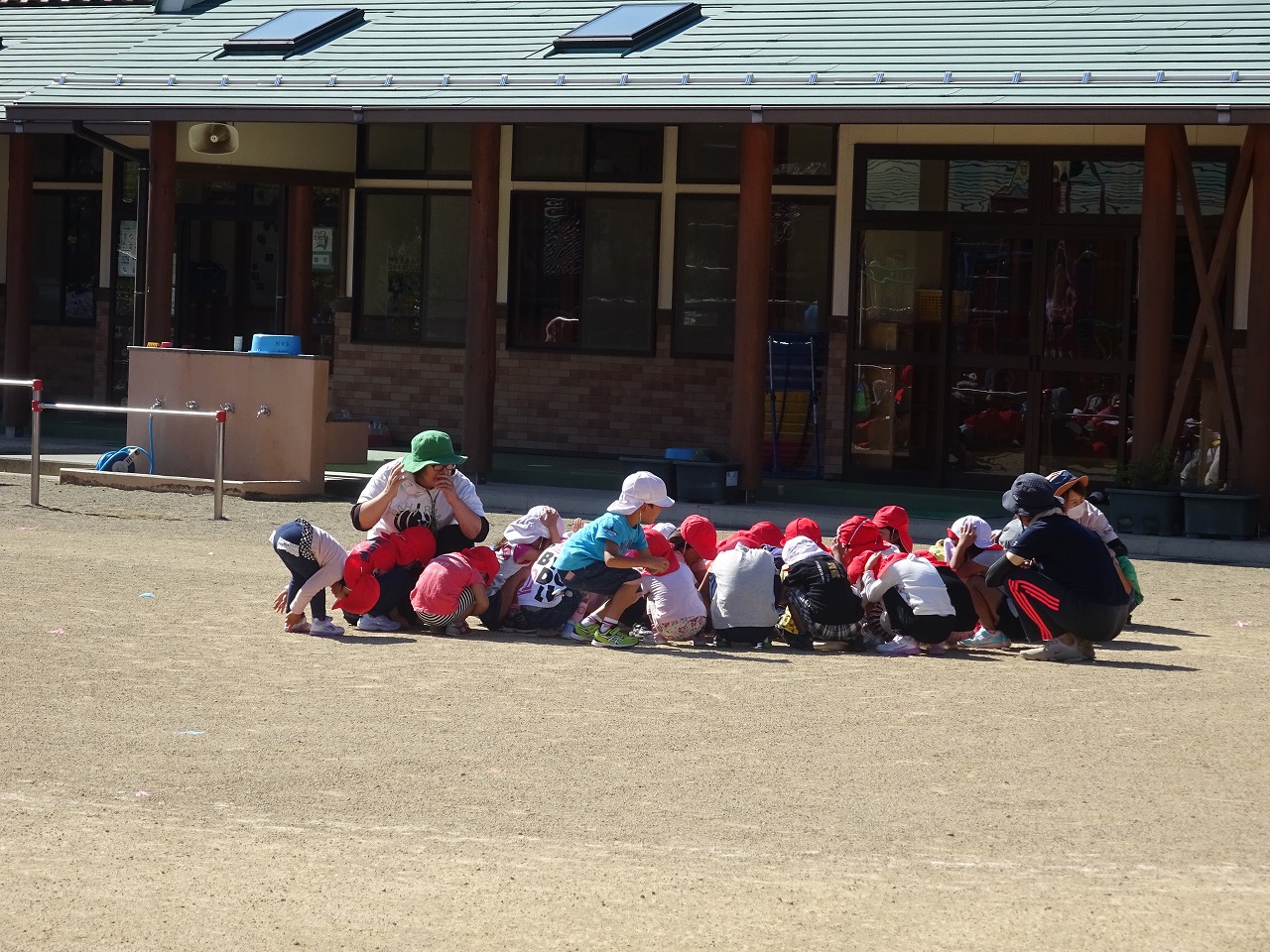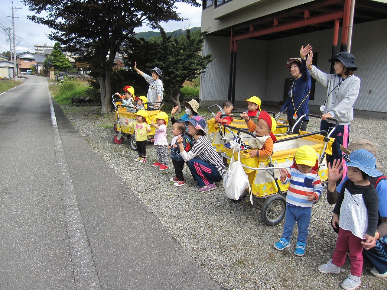 0・1歳児の子ども達は、いつもと違ってテラスでおやつを食べてから、バスに乗って遠足に出かけるお兄さん姉さんを見送りました、 |