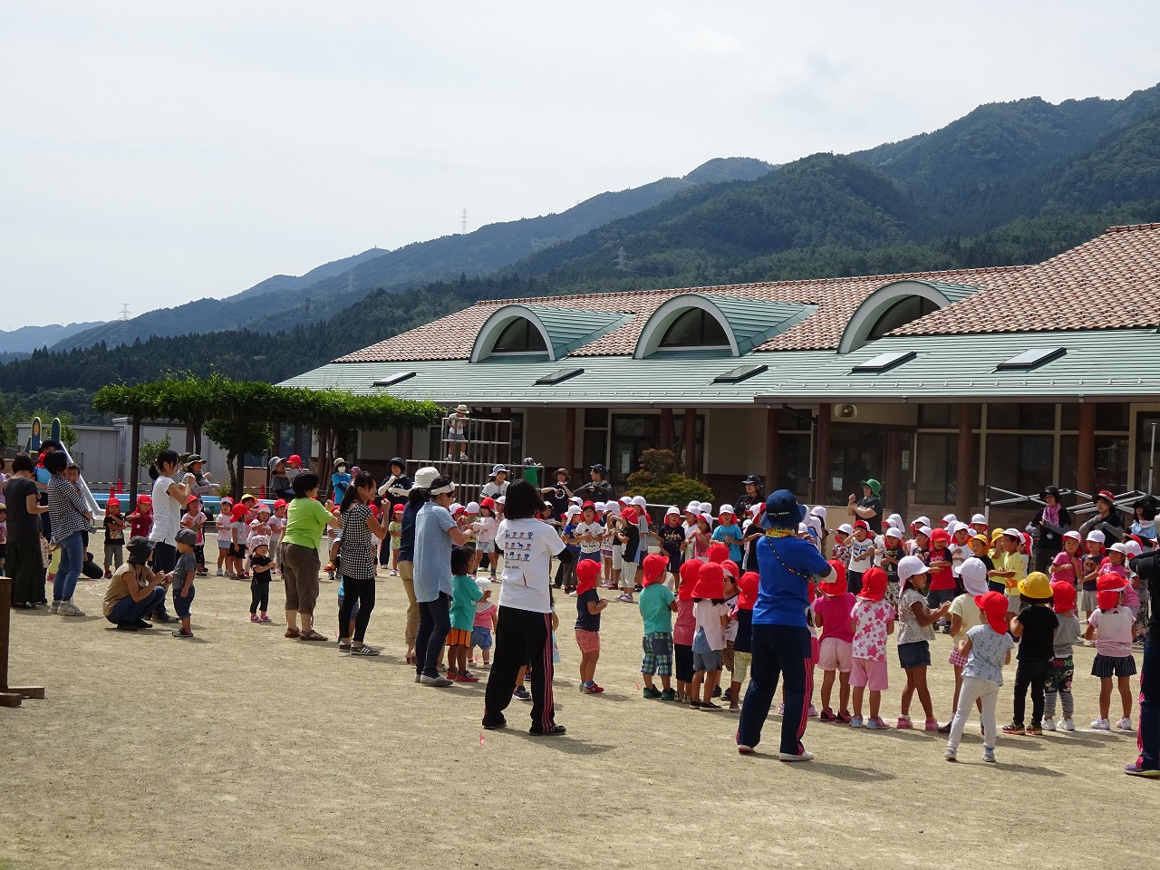 みなみこども園に併設してある萩原子育て支援センターの行事で、未就園児の親子の皆さんが園庭で活動された後、みなみこども園の子ども達と一緒に“アンパンマン体操”をしました。 |