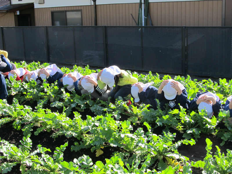 9月に全園児大根の種を蒔きました。年少さんはこれが畑デビューです。 |