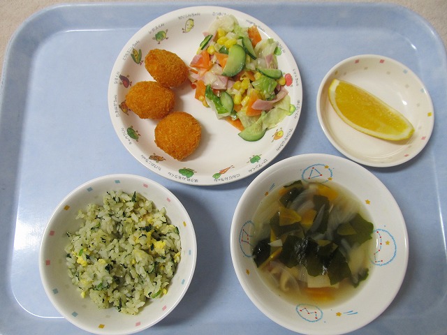 使用食材は、 ・青菜チャーハン(米・しらす干し・卵・ほうれん草・玉ねぎ) ・フレンチサラダ(キャベツ・きゅうり・にんじん・ハム・コーン) ・わかめスープ(わかめ・かまぼこ・にんじん・玉ねぎ・しいたけ)