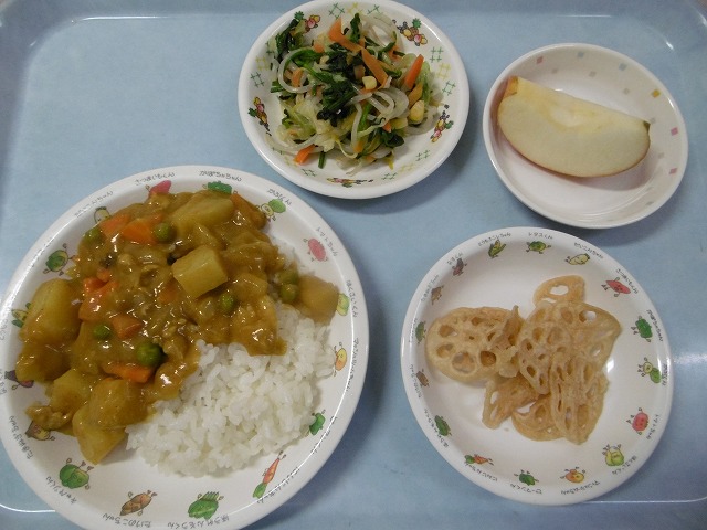 10月11日(火) 給食 ・カレーライス ・ほうれん草ナムル ・れんこんチップス ・りんご