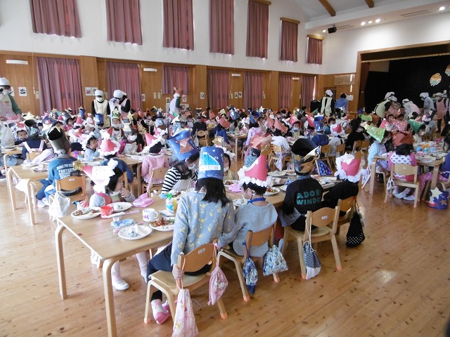 今日は、クリスマス会があり、給食は遊戯室での会食でした。 わかめおにぎりや鶏肉の唐揚げ、ウインナーなど子どもたちの好きなメニューでした。 みんなで、とても楽しい雰囲気で食べていました。