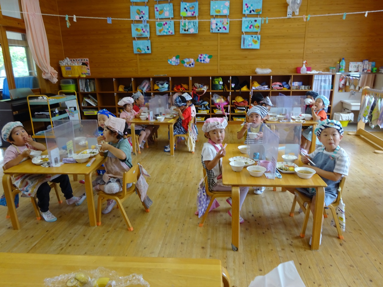 いつもは、メニューの写真をのせるのですが、元気いっぱいの園児たちに声をかけられて、 クラスの写真にしました。 主菜が魚で、サラダにはひじきが入り、苦手なメニューかと思いましたが 楽しそうに食べていました。