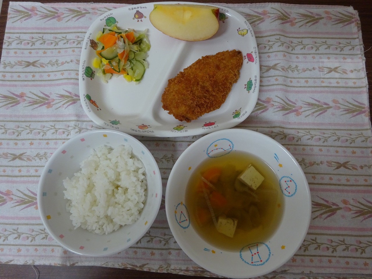 10月2日(水)給食 ・ごはん ・あじフライ ・フレンチサラダ ・五目汁 ・りんご