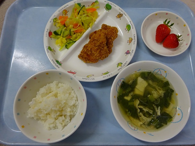 2月27日(水)給食 ・ごはん ・チキンカツ(鶏肉・卵・パン粉) ・フレンチサラダ(キャベツ・きゅうり・にんじん・コーン) ・すまし汁(豆腐・油揚げ・かまぼこ・こまつな・ねぎ) ・いちご