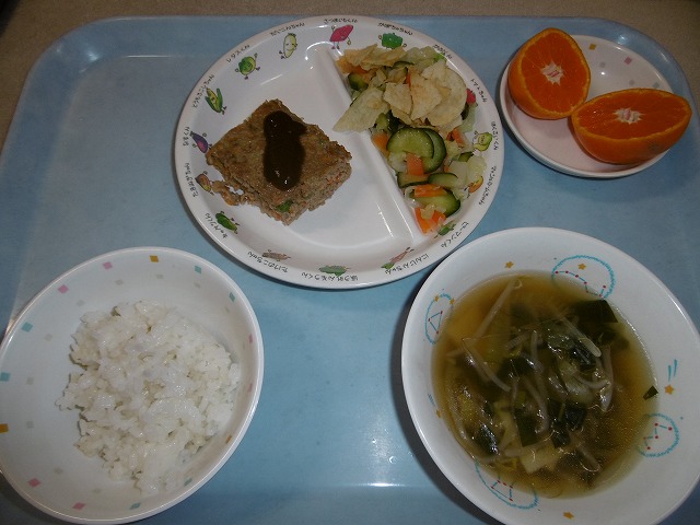 12月19日(水)給食 ・ごはん ・ミートローフ(合挽肉・玉ねぎ・にんじん・グリンピース・卵・パン粉・牛乳) ・チップスサラダ(ポテトチップス・キャベツ・きゅうり・にんじん) ・わんたんスープ(ワンタン・チンゲン菜・もやし・ねぎ) ・みかん