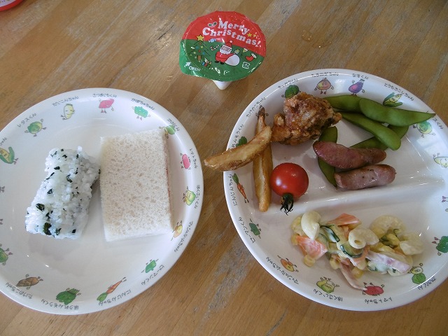 12月21日(金)給食 ・わかめおにぎり ・ジャムサンド ・鶏肉のから揚げ・ウインナー・フライドポテト ・マカロニサラダ(マカロニ・きゅうり・にんじん・コーン・ハム・マヨドレ) ・プチトマト・枝豆 ・三色ゼリー