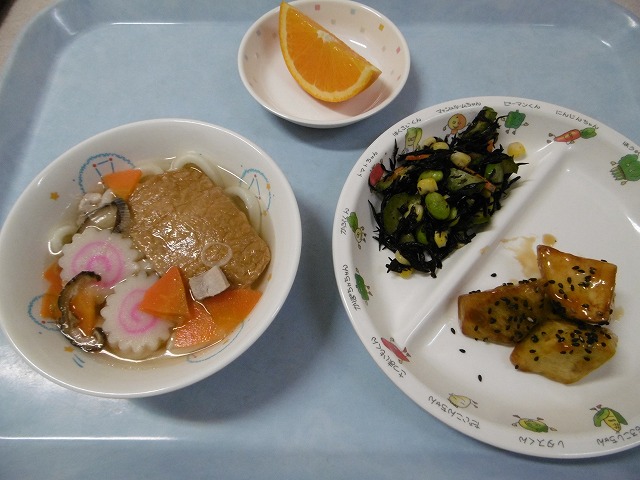 11月28日(水) 給食 ・きつねうどん(うどん・油揚げ・鶏肉・なると・にんじん・ねぎ・干ししいたけ) ・ひじきサラダ(ひじき・きゅうり・にんじん・えだまめ・コーン) ・大学芋(さつまいも・ごま) ・オレンジ