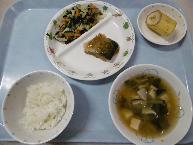 11月29日(木) 給食 ・ごはん ・さばのみぞれ煮(さば) ・ごもくあえ(ほうれん草・キャベツ・にんじん・油揚げ・しらたき・干ししいたけ) ・みそ汁(豆腐・玉ねぎ・しいたけ・わかめ・みそ) ・バナナ