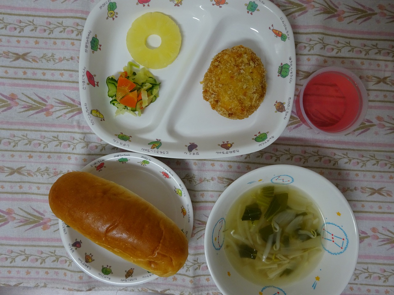 3月13日(水)給食:誕生会メニュー ・ロールパン ・手作りコロッケ ・キャベツサラダ ・コンソメスープ ・ベビーパイン(※今月の誕生児のみゼリーがつきます。)