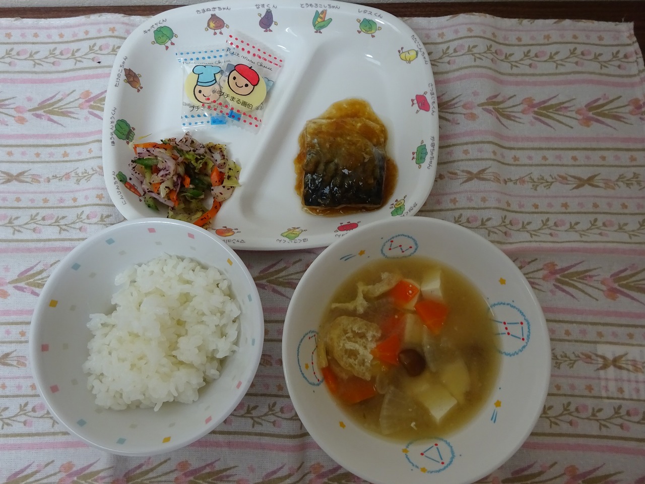 3月14日(木)給食 ・ごはん ・さばのみぞれ煮 ・ゆかり和え ・みそ汁 ・チーズ