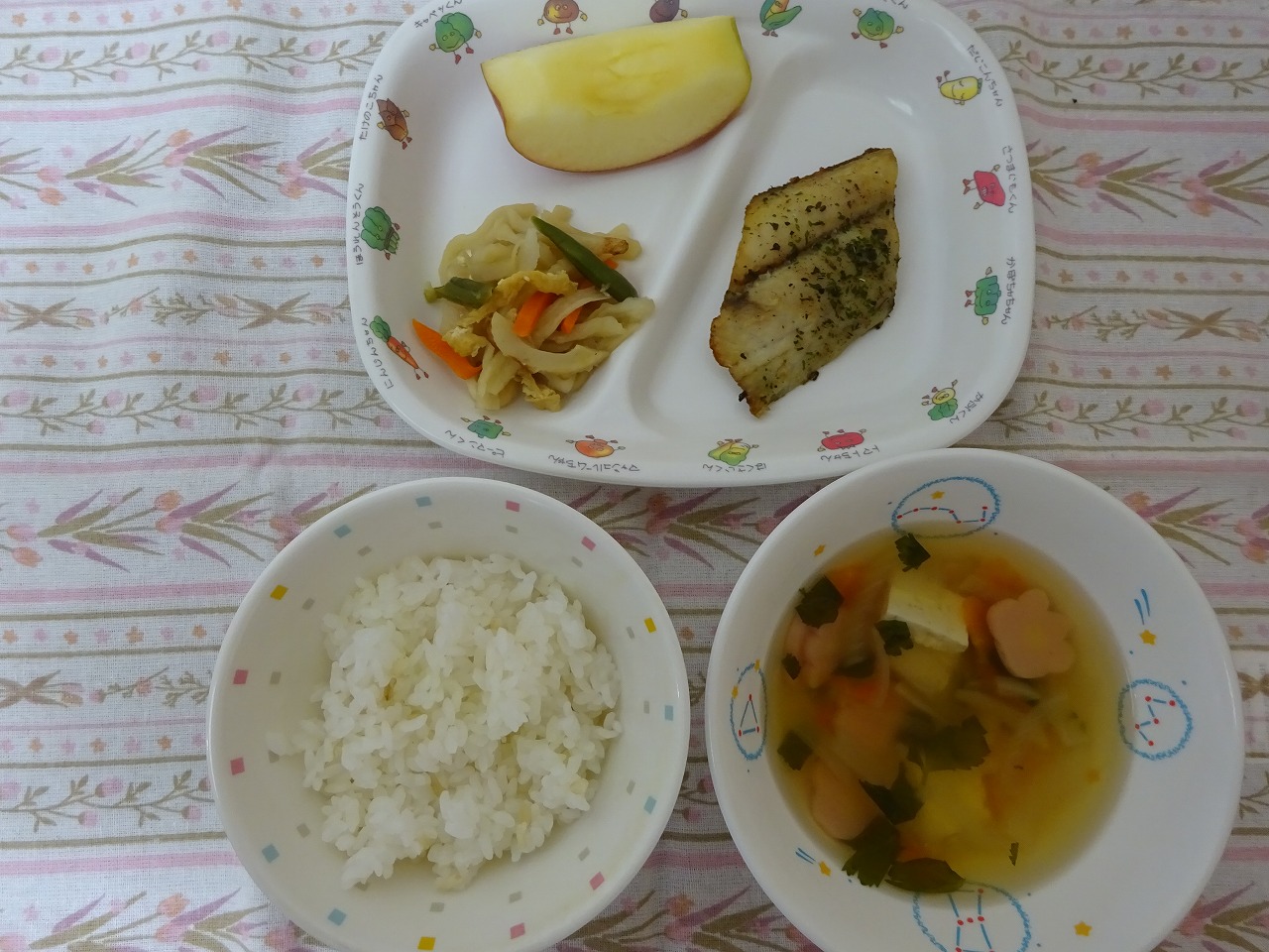 3月19日(火)給食 ・ごはん ・さわらの香草焼き ・切干大根の煮物 ・すまし汁 ・りんご