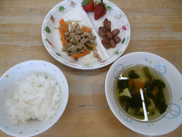 4月20日(金)給食 ・ごはん ・豚肉のしょうが焼き(豚肉・玉ねぎ・にんじん・ピーマン) ・金時豆の甘煮 ・すまし汁(豆腐・にんじん・こまつな・しめじ・ねぎ) ・いちご