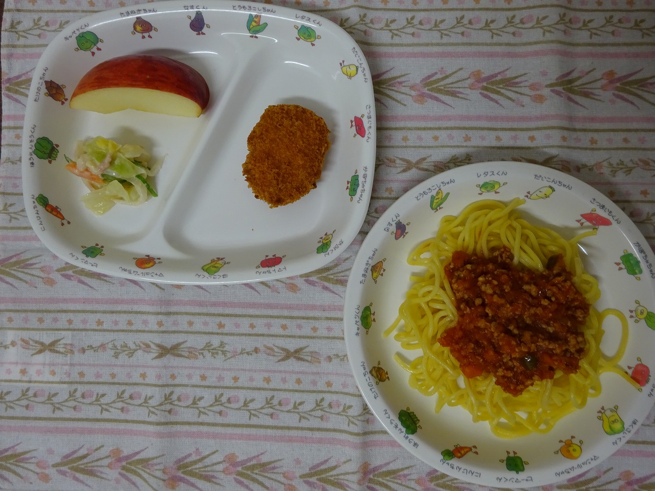 2月28日(水)給食 ・ミートスパゲッティ ・ミニ野菜コロッケ ・大根サラダ ・りんご