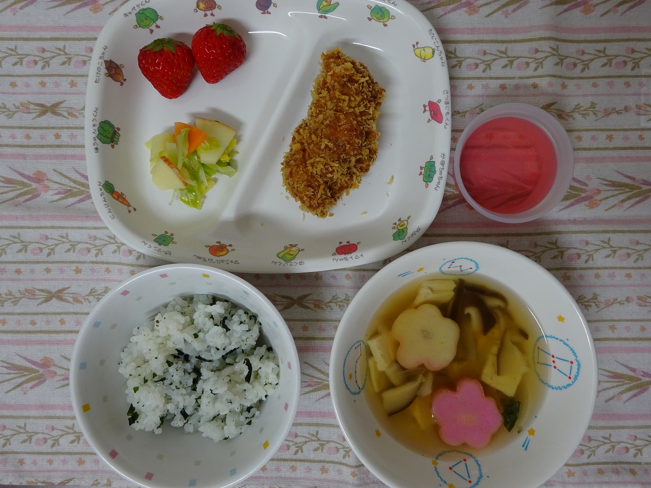 2月29日(木)給食:誕生会メニュー ・わかめごはん ・チキンカツ ・白菜とりんごのサラダ ・すまし汁 ・いちご(※今月の誕生児にはゼリーが付きます。)