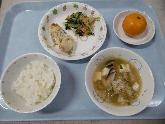 11月21日(火)給食 ・ごはん ・鮭のマヨネーズ焼き(鮭・玉ねぎ・マヨネーズ) ・ほうれん草のごまあえ(ほうれん草・キャベツ・にんじん・もやし・ごま) ・みそ汁(豆腐・油揚げ・だいこん・しいたけ・ねぎ・みそ) ・みかん