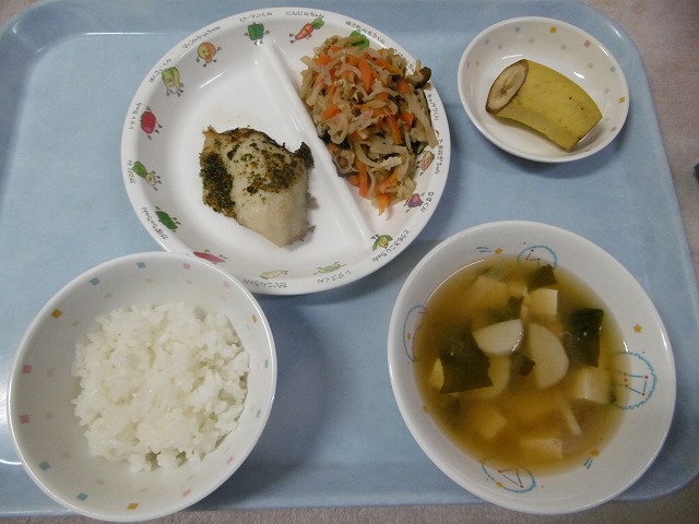 12月 1日(金) 給食 ・ごはん ・さわらの香草焼き(さわら・パセリ) ・切干大根の煮物(切干大根・油揚げ・にんじん・いんげん・干ししいたけ) ・みそ汁(豆腐・さといも・玉ねぎ・わかめ・みそ) ・バナナ