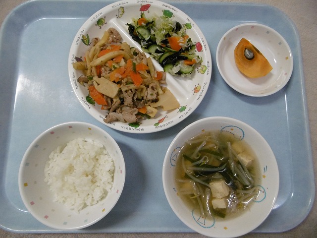 11月1日(水)給食 ・ごはん ・豚肉とピーマンのソテー(豚肉・ピーマン・にんじん・たけのこ・ポテト) ・きゅうりの酢の物(きゅうり・キャベツ・にんじん・しらす干し・わかめ) ・もやしスープ(もやし・豆腐・玉ねぎ・にら) ・かき
