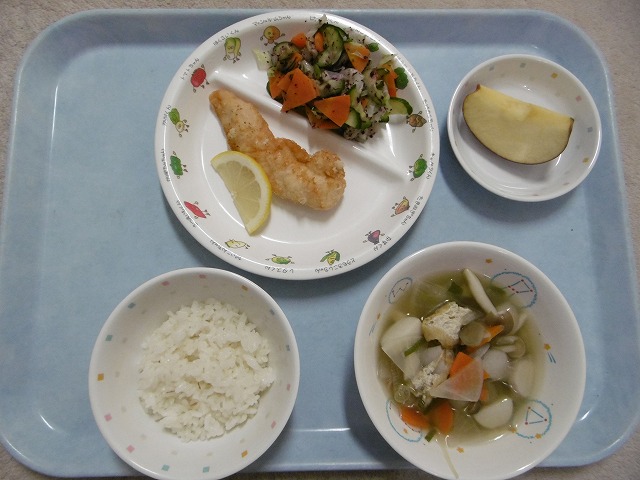 11月2日(木)給食 ・ごはん ・ささみのレモン煮(ささみ・レモン) ・キャベツのゆかりあえ(キャベツ・きゅうり・にんじん・ゆかり) ・五目汁(さといも・大根・にんじん・ごぼう・油揚げ・しめじ・ねぎ) ・りんご