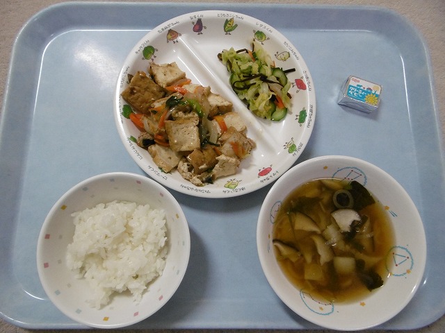 11月7日(火)給食 ・ごはん ・厚揚げの中華炒め(厚揚げ・豚肉・玉ねぎ・にんじん・にら) ・塩昆布あえ(キャベツ・きゅうり・にんじん・塩昆布) ・みそ汁(じゃがいも・しいたけ・ねぎ・わかめ・みそ) ・チーズ
