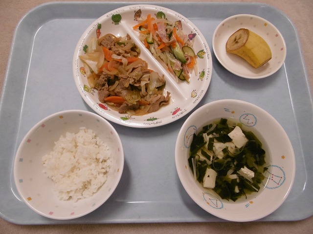 8月4日(金)給食 ・ごはん ・豚肉のみそ炒め(豚肉・キャベツ・にんじん・玉ねぎ・ピーマン・みそ) ・マロニー中華あえ(マロニー・ハム・キャベツ・きゅうり・にんじん) ・すまし汁(豆腐・こまつな・えのきたけ・ねぎ) ・バナナ